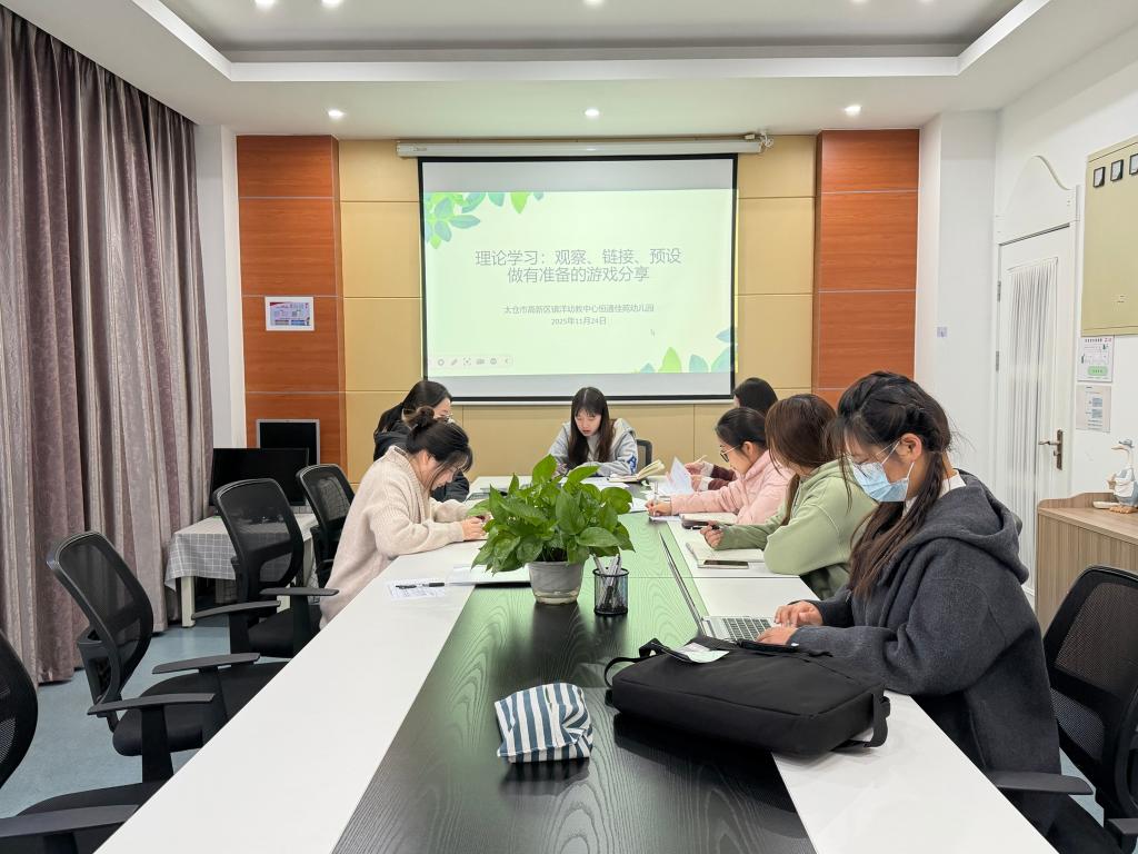 为深入落实《幼儿园保育教育质量评估指南》精神,切实提升教师在游戏分享环节的专业能力,让游戏分享真正成为延续幼儿探究兴趣、促进经验提升的有效途径,太仓市高新区镇洋幼教中心恒通佳苑幼儿园于2025年11月24日组织开展了“观察、链接、预设做有准备的游戏分享”理论课程培训,活动由汪敏老师主持,全体教师参与其中。
