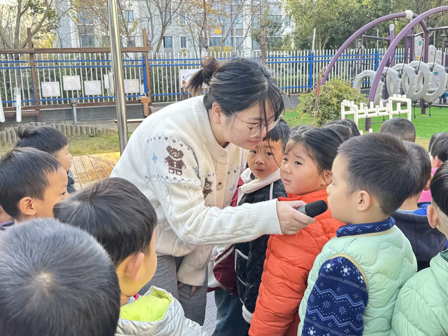 李老师还鼓励幼儿勇敢挑战自我,不怕高、不怕摔跤,把运动中的小困难变成成长的阶梯。她提到,和小伙伴一起运动不仅能收获快乐、交到好朋友,还能让心情更轻松、学习更有精神。同时,李老师分享了实用的运动小贴士:穿舒适的运动装备、做好热身运动、循序渐进参与、及时补充水分,帮助幼儿科学运动。讲话过程中,李老师还与幼儿互动,邀请大家分享自己喜欢的运动,现场氛围热烈。