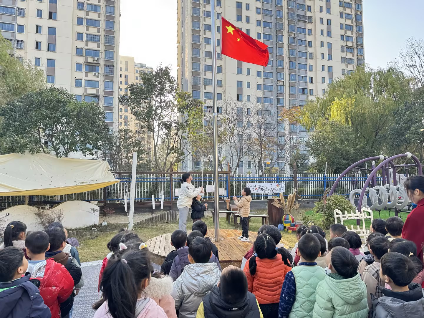 2025年12月8日上午,太仓市高新区镇洋幼教中心恒通佳苑幼儿园进行了升国旗仪式,由李双双老师主持进行。