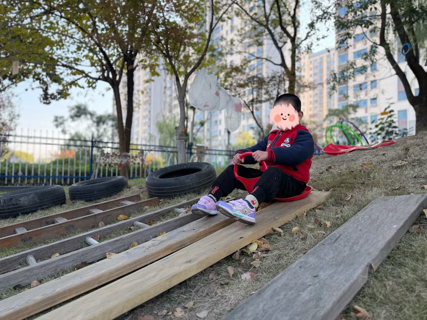 星星在滑草时调整滑板方向、抓握把手的动作,体现出《指南》中“具有一定的平衡能力,动作协调、灵敏”的发展目标;滑板歪斜时用脚调整方向,展现了灵活的问题应对能力,符合“能尝试控制自己的身体动作”的小班幼儿发展特点。同时,他主动尝试改变滑板角度、调整身体姿势的行为,表现出强烈的探究欲望,契合《指南》中“对周围的事物、现象感兴趣,有好奇心和求知欲”的目标,也为后续场地探索与肢体控制能力发展奠定了基础。