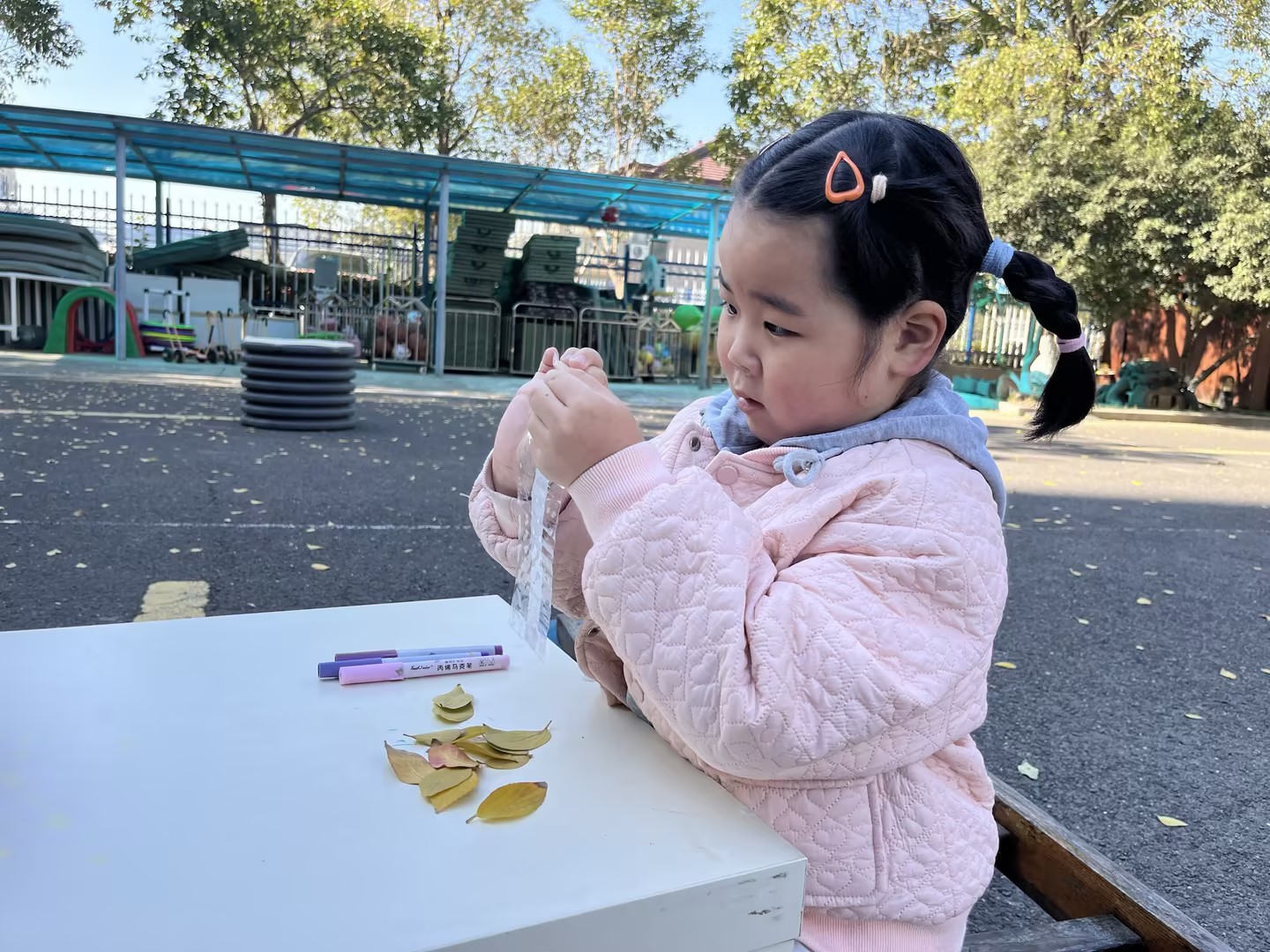 佳佳在西树林里挑选落叶,专注挑选黄色叶子和绿色柳叶,将两种颜色的叶子分开摆放。取来透明膜和双面胶后,她先尝试撕双面胶,手指捏住胶边反复拉扯才撕下一小段,贴在透明膜边缘,再拿起一片黄色叶子按压在胶面上。部分双面胶粘贴不平整,叶子容易移位,她便用指甲轻轻刮压胶面,确保叶子固定。随后交替粘贴黄、绿两色叶子,沿透明膜边缘排了一圈,中间再用小叶片填充,还对着自己的头比对大小,调整叶片位置让王冠更贴合。期间遇到双面胶粘在手上的情况,她耐心搓掉后继续操作,完成后兴奋地举着王冠向同伴展示。